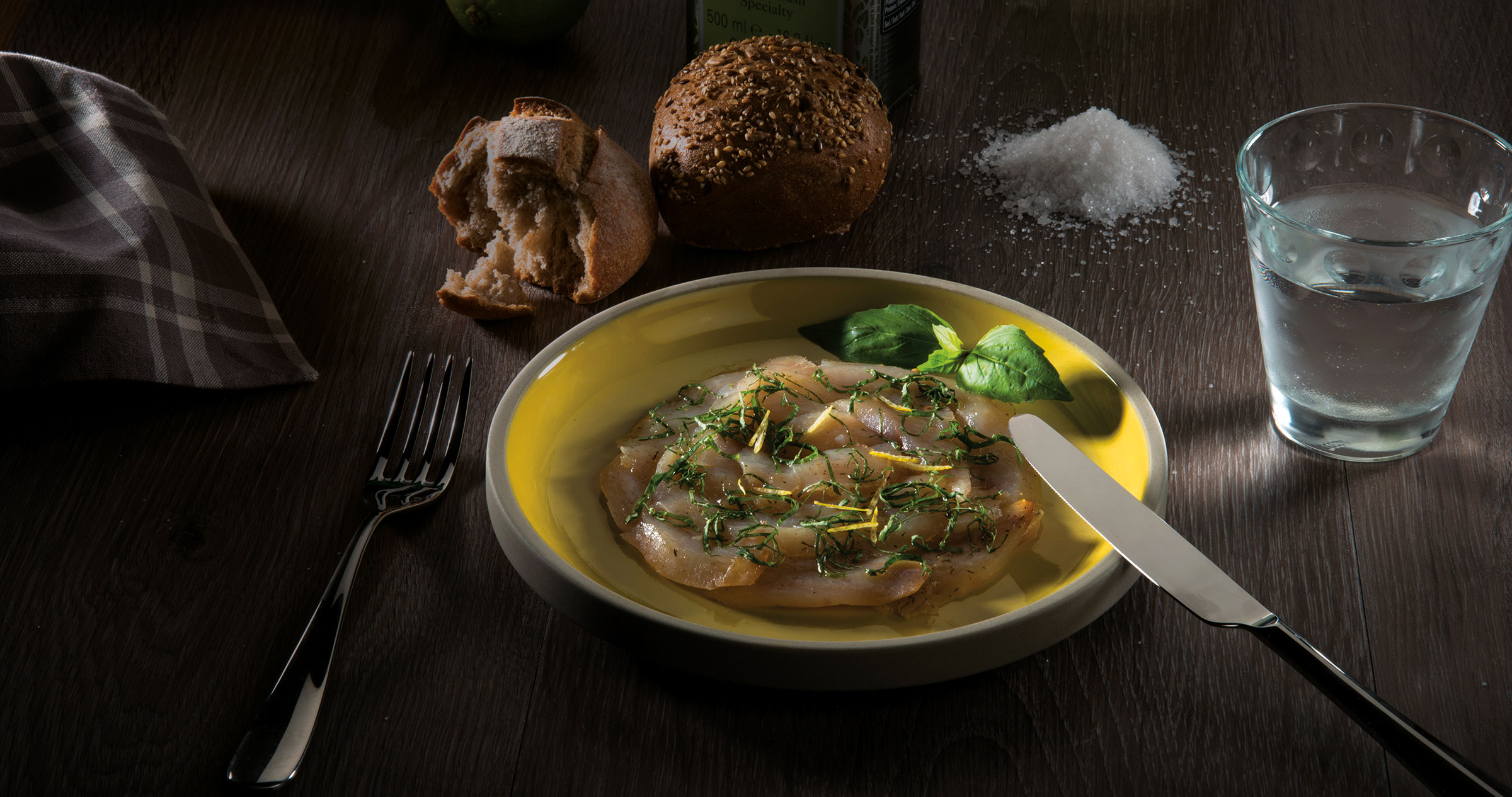 Lors de la préparation des assiettes, disposer les tranches de filets en carpaccio. Parsemer le tout de basilic ciselé et de quelques zestes de citron fins. Décorer avec une feuille de basilic entière.