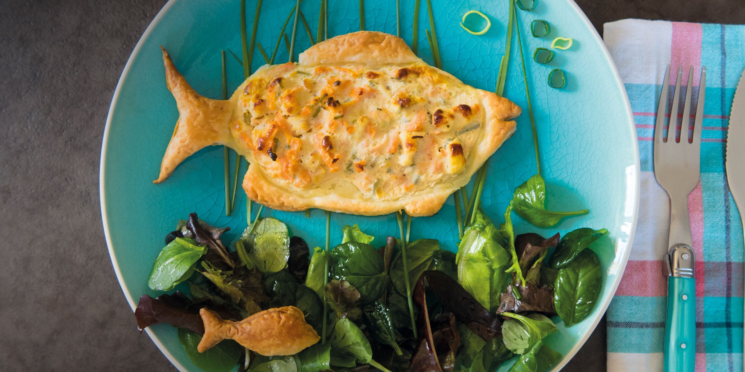 Sortir la pâte feuilletée du frigo, la dérouler et découper 4 formes de poissons (env. 10 x 20 cm). Les placer sur une plaque couverte de papier sulfurisé. Déposer au centre de chaque poisson l’équivalent de 2 cuillères à soupe de ta masse.