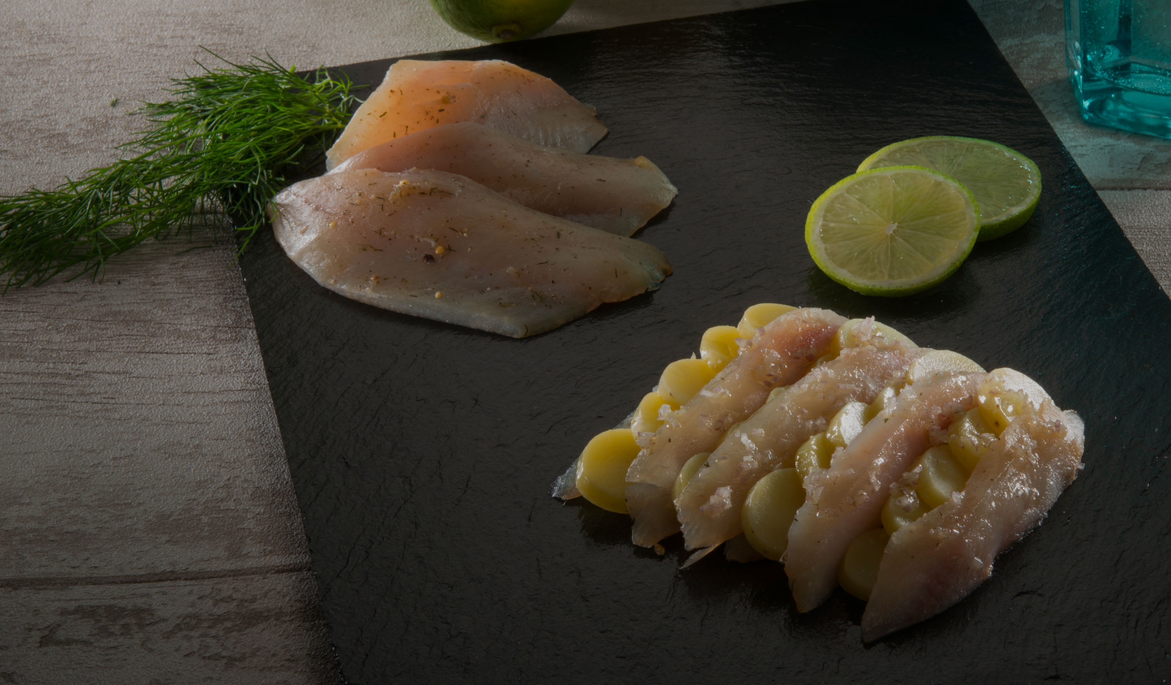 Marinade : Mélanger l’huile d’olive, les échalotes finement hachées, le jus et le zeste d’un quart du citron, un quart de la botte d’aneth ciselée et assaisonner légèrement. Napper les pommes de terre ratte et les filets avec la marinade.