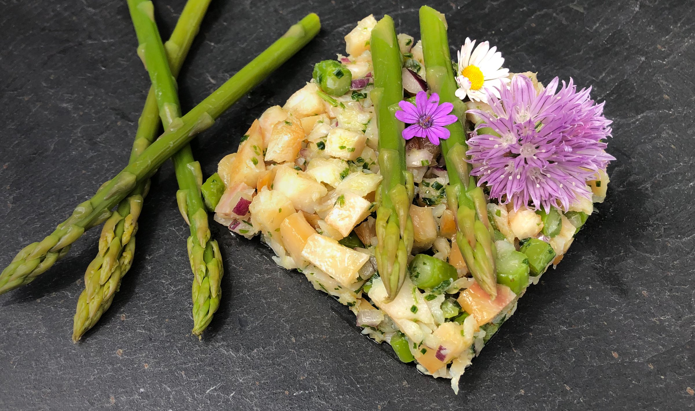 Rectifier l’assaisonnement selon vos goûts, puis dresser le tartare à l’aide d’un emporte-pièce. Déposer dessus 1 ou 2 pointes d’asperges et quelques jolies fleurs comestibles.