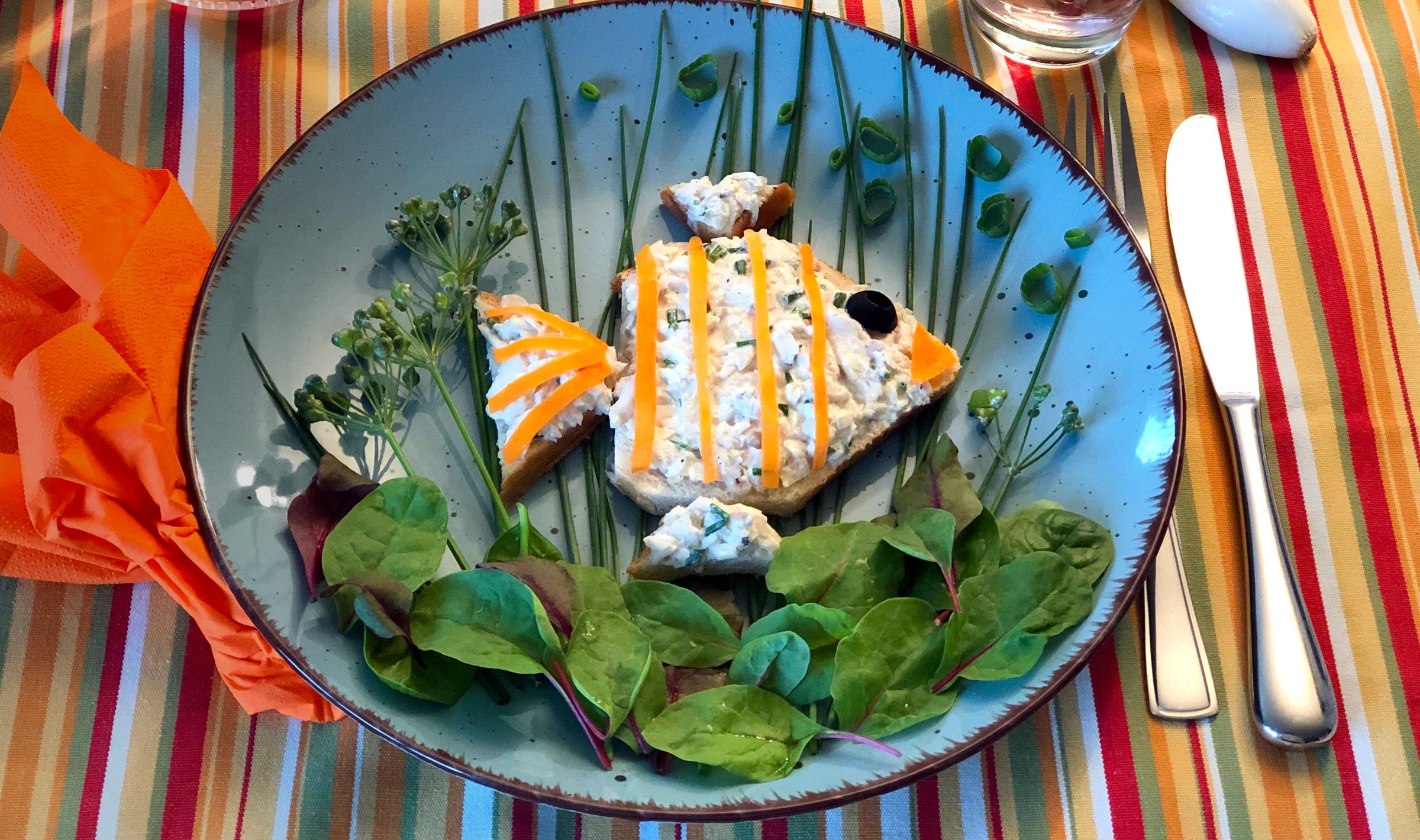 Dressage : Tartiner l’équivalent d’une cuillère à soupe par toast puis couper 3 coins de chaque toast pour en faire la queue et les nageoires, décorer avec les lanières de carottes et 1 tranche d’olive noire (en guise d’oeil).